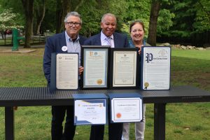 County Legislator Benjamin Boykin, District 5 was recognized as a “Civic Champion Thursday afternoon at the annual meeting of the League of Women Voters White Plains. The man who holds the distinction of serving for the longest consecutive time as a County Legislator, and twice as Chairman of the Board, is shown holding the series of awards he received yesterday. On the left is Alan Cass, President of the League, Legislator; and Libby Hollahan, Director of Communications.