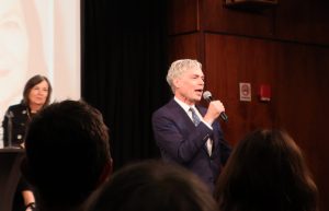With Ms. Morrison at left, White Plains Mayor Thomas Roach thanked the guests for supporting the White Plains Library and reminisced how his mother took him to the library in his home town. Mayor Roach has spearheaded the improvements in the library The Trove, The Edge and the Hub.
