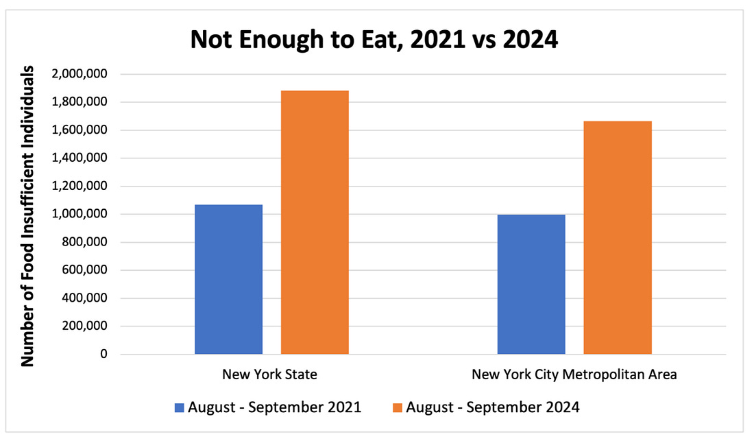 Food prices in New York City have soared, rising faster than the national average, up 56% between 2012 to 2023, compared to 46% nationally. (Income has also increased in the city, but it’s not keeping up with climbing food costs.) At the same time, food insecurity—when someone doesn’t have enough to eat at least some of the time—affects 1.2 million New Yorkers in the city. This is up 76% since 2021, with 1 in 6 households with children lacking enough to eat. The figure is higher than the 55% increase seen nationwide.