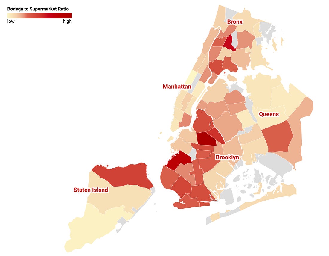 Figure from Hunger Free America. In NYC, rates are highest in the Bronx, where 1 in 5 residents and 1 in 3 children experience food insecurity. Staten Island has the lowest, with 11.5% of residents experiencing this problem. This isn’t just a big city issue. Across New York state, 1 in 8 (12.5%) of residents lived in food insecure households from 2021 to 2023, including 1 in 6 children. On top of that, cuts to the SNAP program in the “Big Beautiful Bill”—signed into law over the summer—will likely further exacerbate food insecurity in New York, as they reduce food assistance for low-income families. But the issue runs deeper than not having the income to pay for enough food. Many neighborhoods don’t even have grocery stores. Several New York neighborhoods are considered “food deserts”—where it’s difficult to buy healthy, nutritious food at an affordable price. These deserts often occur when large grocery companies avoid investing in lower-income neighborhoods because they have less purchasing power compared to wealthier neighborhoods, despite high demand for groceries. A way to measure this in NYC is to look at the ratio of bodegas to supermarkets across neighborhoods. The Bronx, which has the highest food insecurity in the city, has about 35 bodegas per 1 supermarket.
