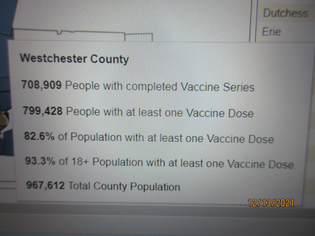 Currently Westchester County has 708,909 persons of its 1.4 million population  fully vaccinated and 93% of the population over 18 with one dose.  Those 224,811 who only have one dose need to get those shots and parents of children under 12 but not under 5 need to get your children vaccinated to keep the schools open.