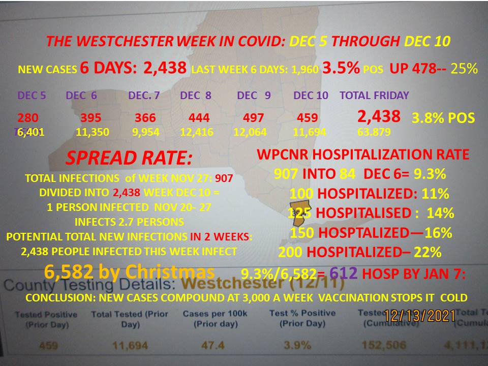 Westchester now is on track for over 6,582, based on the 2,438 new infections sufferers  in 6 days last week. Those 2,438 were infected by most of the 907 newly infected Westchesterites two weeks prior during the week of November 20 to 27, the first victims of the Thanksgiving three day holiday dividing the  2,438 figure by 907  produces an infection rate of 2.8 showing every person infected two weeks ago spread the disease to close to 3 persons.