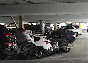 White Plains Police Photo shows damage to three vehicles when portion of the New York Life Parking Garage adjacent to Westchester One partially collapsed this morning. No one was injured. The Department of Public Safety said they were “accessing” the situation. The Department put in a support column as a precautionary measure, the Westchester Business Journal reported.