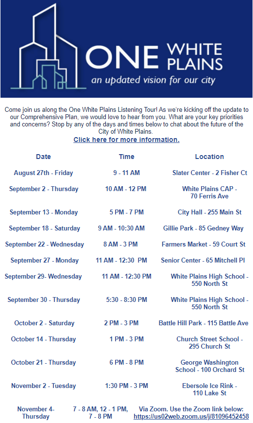 If you have any questions please go to https://one-white-plains-comprehensive-plan-1-wp-planning.hub.arcgis.com/ or feel free to reach out to us at wprra@yahoo.com.