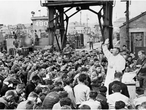 U.S NAVY ASSAULT TROOPS WERE BLESSED BY THE CATHOLIC CHAPLIN BEFORE LEAVING ON THE ASSAULT BOATS FROM THE ENGLISH COAST.